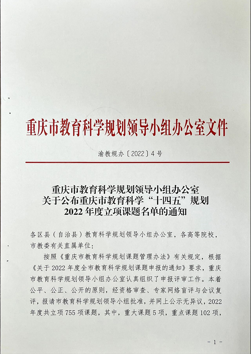 重庆市教育科学规划领导小组办公室 关于公布重庆市教育科学“十四五”规划2022年度立项课题名单的通知 作者: 来源: 发布时间:2022年09月13日 点击数: 次 【字体:小 大】 分享到: 【打印正文】