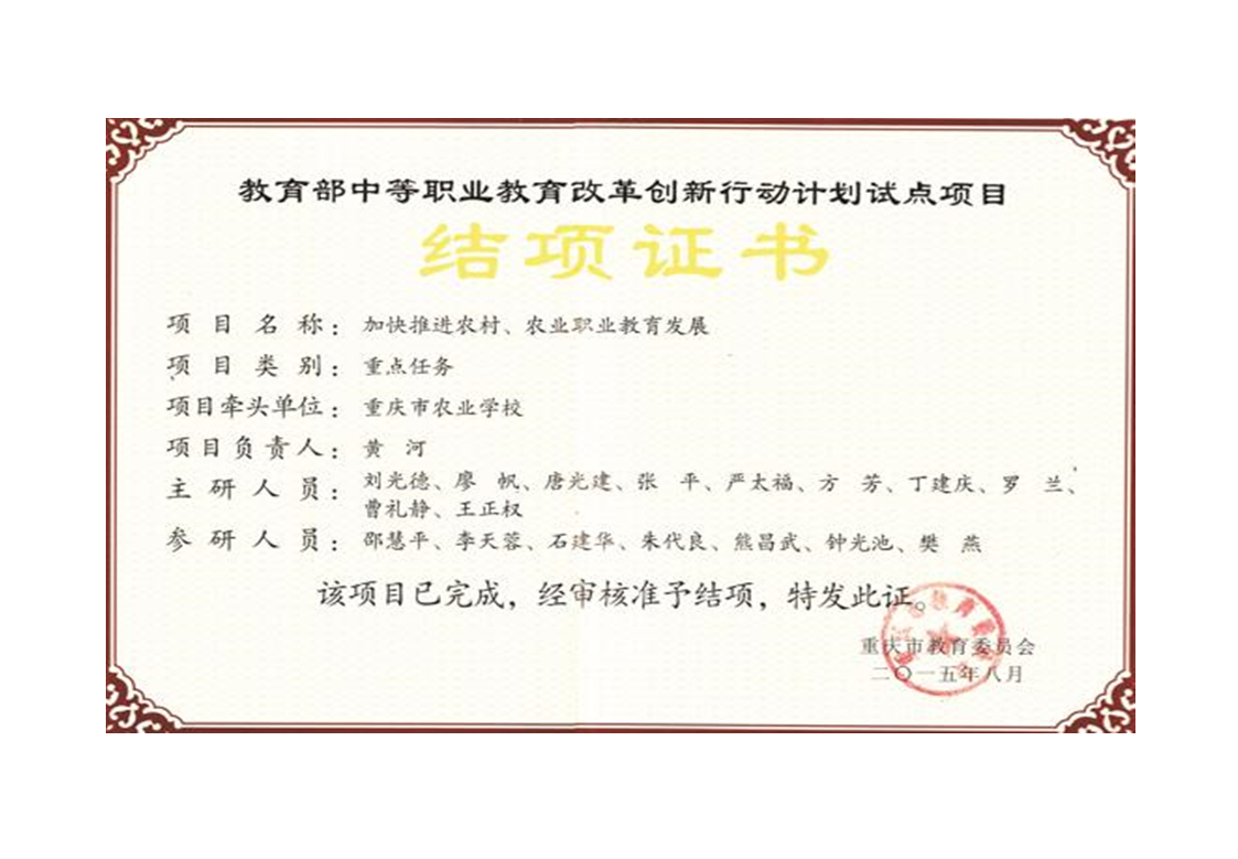 33.教育部中等进职业教育改革创新行动计划试点项目《中等职业教育改革创新行动计划重点任务项目加快推进农村、农业职业教育发展(重庆市教育委员会【2011】31号文批准)》结项 作者: 来源: 发布时间:2022年11月19日 点击数: 次 【字体:小 大】 分享到: 【打印正文】