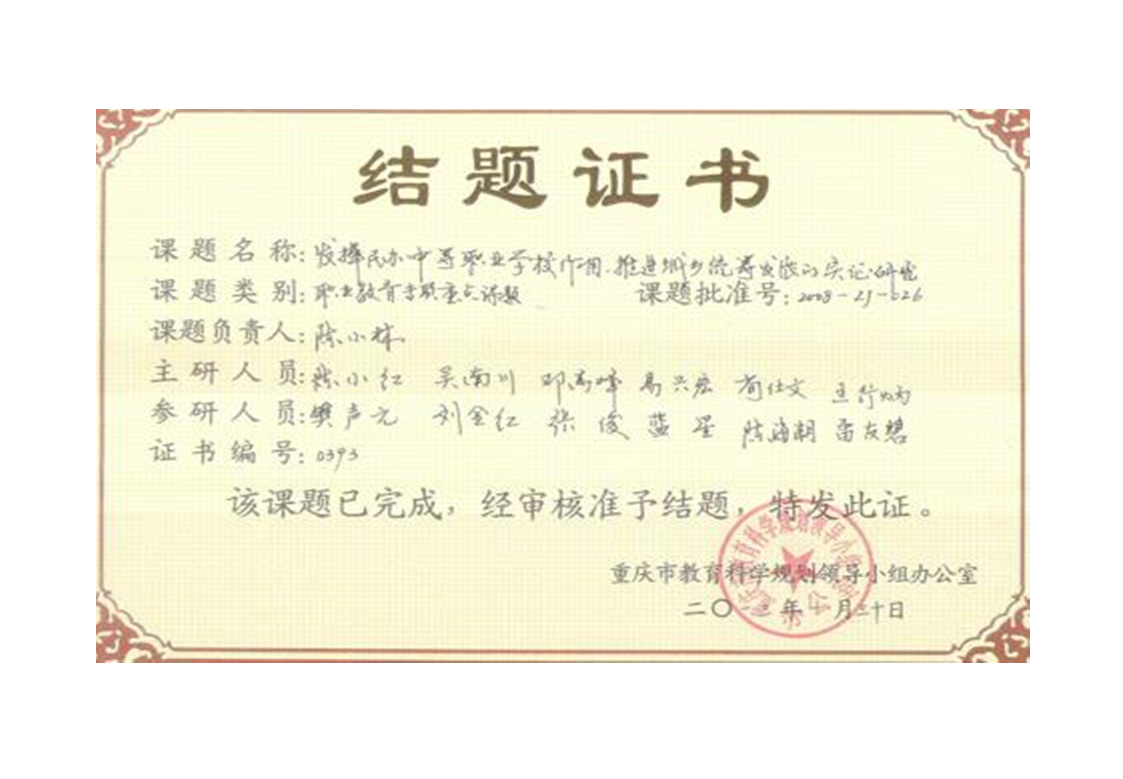 31.重庆市职业教育专项重点课题《发挥民办中等职业学校作用,推动城乡统筹发展的实证研究(证书编号:0393)》结题 作者: 来源: 发布时间:2022年11月19日 点击数: 次 【字体:小 大】 分享到: 【打印正文】