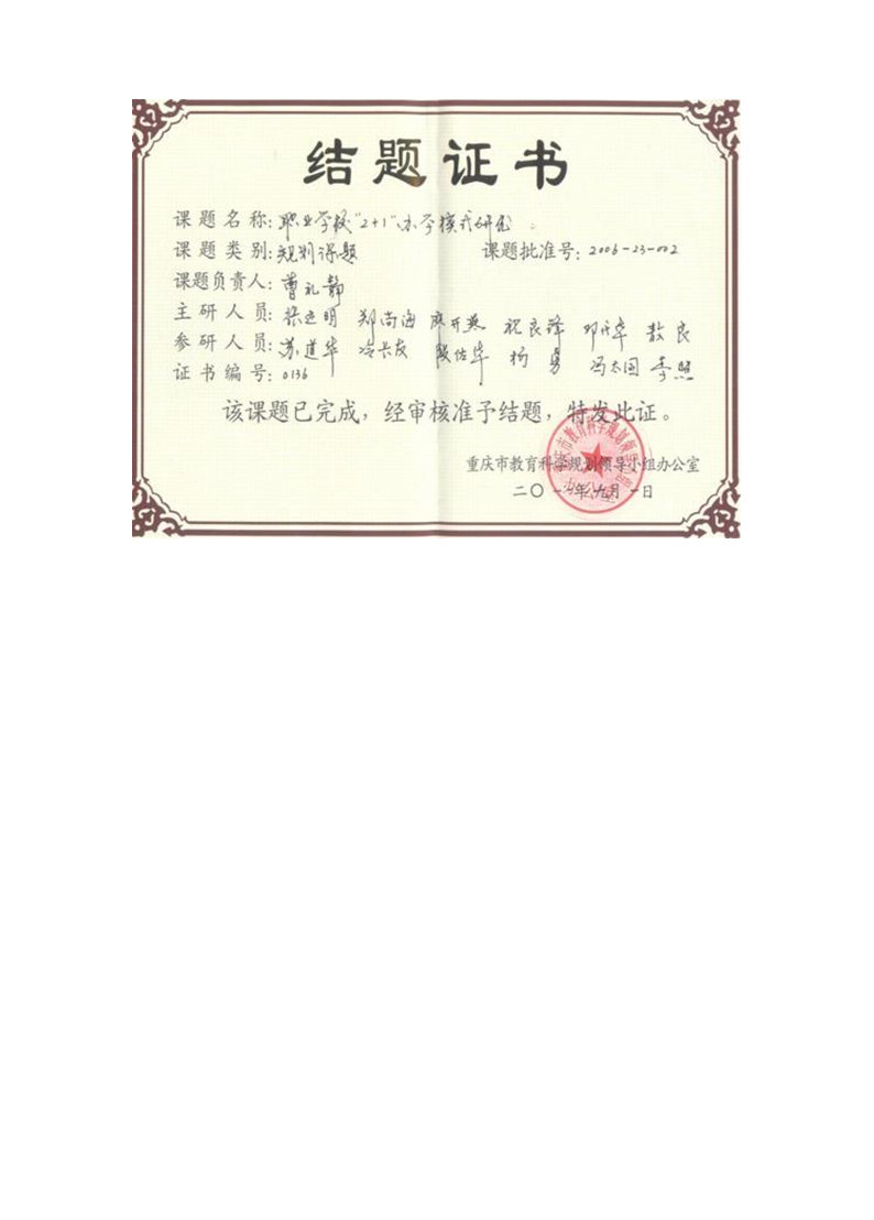 29.重庆市教育科学规划课题《职业学校2+1办学模式研究(课题批准号:2006-23-002)》结题 作者: 来源: 发布时间:2022年11月19日 点击数: 次 【字体:小 大】 分享到: 【打印正文】