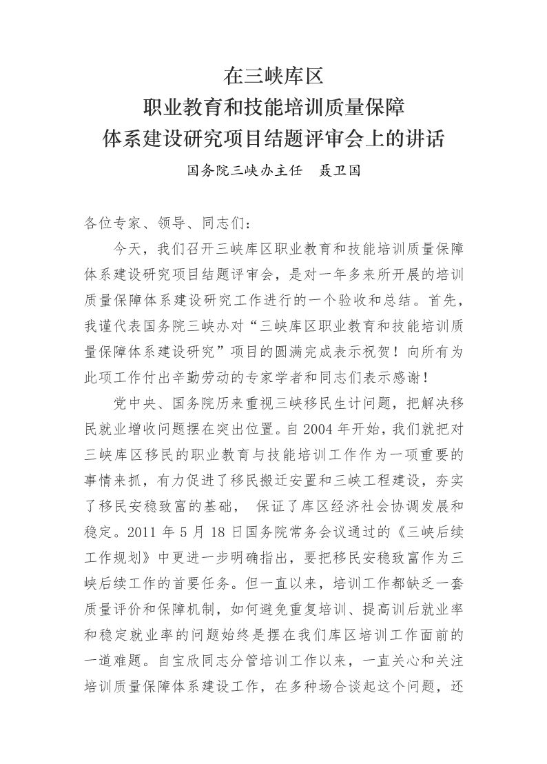 1.国务院三峡办主任聂卫国在三峡库区职业教育和技能培训质量保障体系建设研究项目结题评审会上的讲话 作者: 来源: 发布时间:2022年11月04日 点击数: 次 【字体:小 大】 分享到: 【打印正文】