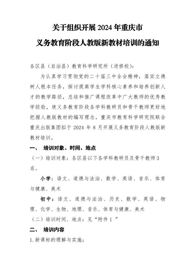 关于组织开展2024年重庆市义务教育阶段人教版新教材培训的通知