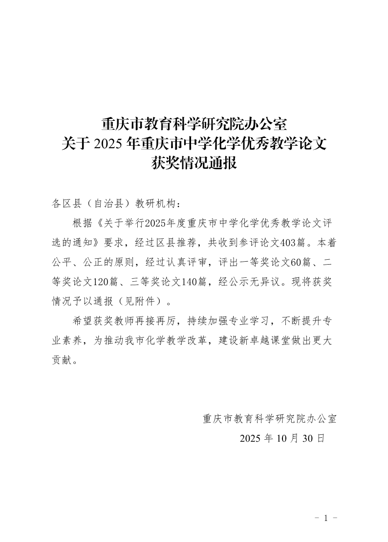 利乐娱乐 办公室关于2025年重庆市中学化学优秀教学论文获奖情况通报