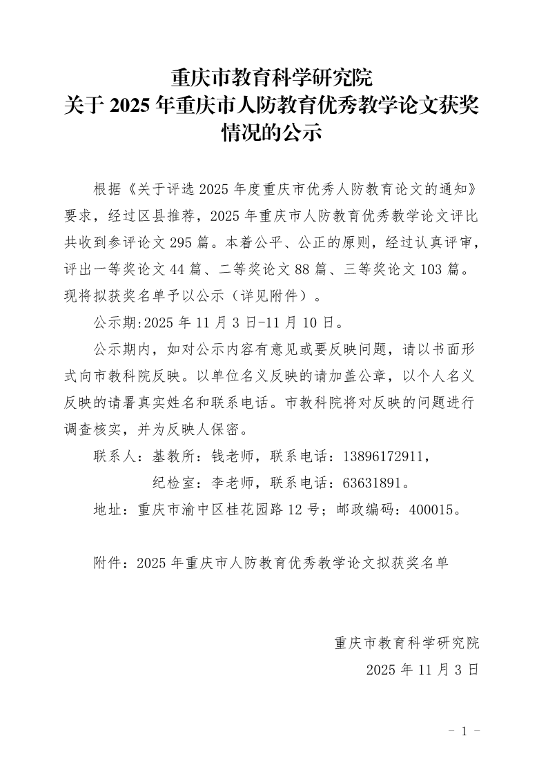 利乐娱乐 关于2025年重庆市人防教育优秀教学论文获奖情况的公示