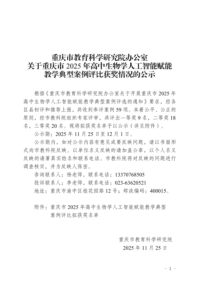 利乐娱乐 办公室关于重庆市 2025年高中生物学人工智能赋能教学典型案例评比获奖情况的公示