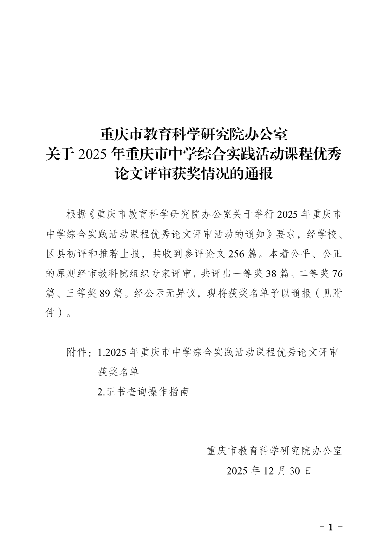 利乐娱乐 办公室关于2025年重庆市中学综合实践活动课程优秀论文评审获奖情况的通报