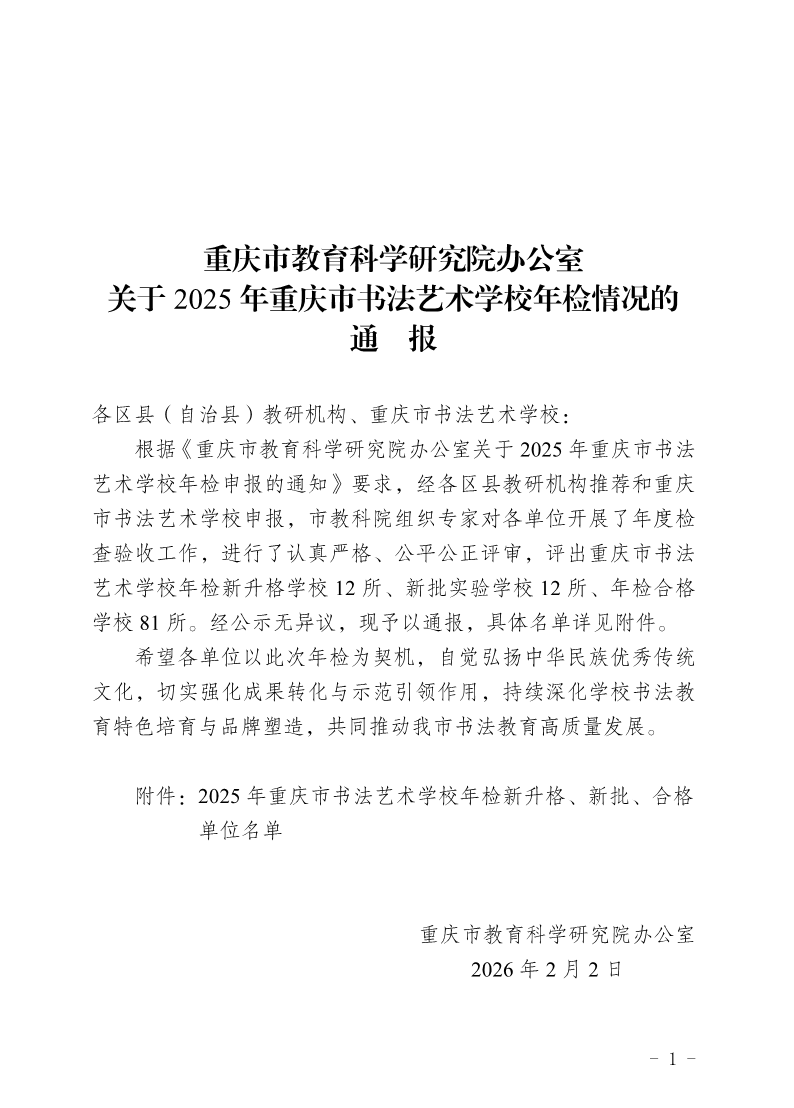 利乐娱乐 办公室关于2025年重庆市书法艺术学校年检情况的通报