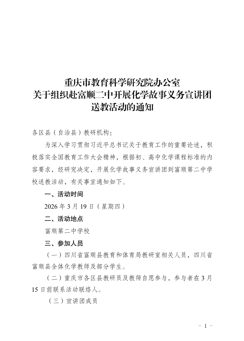 利乐娱乐 办公室关于组织赴富顺二中开展化学故事义务宣讲团送教活动的通知
