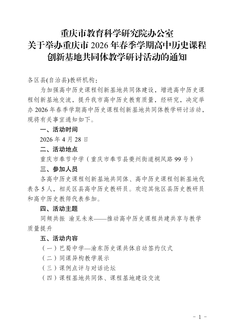 利乐娱乐 办公室关于举办重庆市2026年春季学期高中历史课程创新基地共同体教学研讨活动的通知