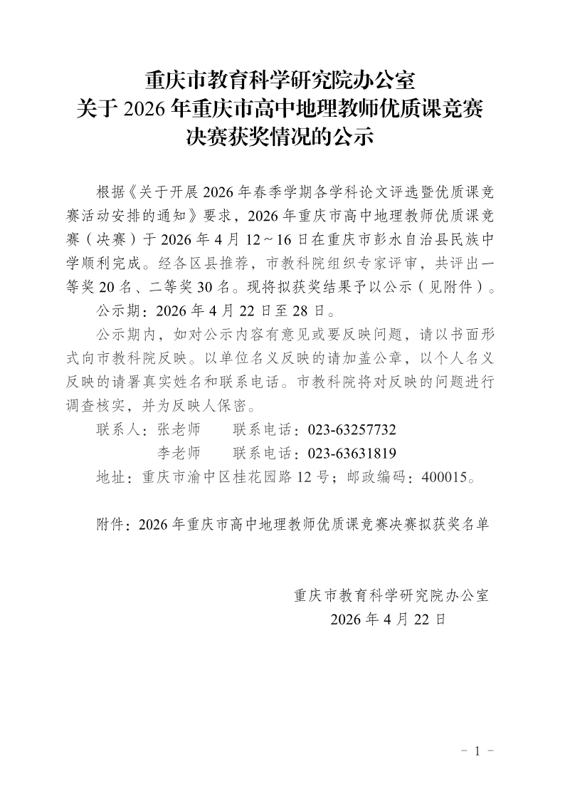 利乐娱乐 办公室关于2026年重庆市高中地理教师优质课竞赛决赛获奖情况的公示