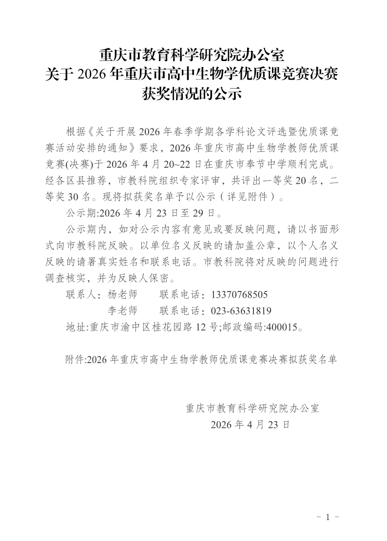 利乐娱乐 办公室关于2026年重庆市高中生物学优质课竞赛决赛获奖情况的公示