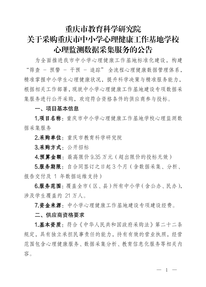 利乐娱乐 关于采购重庆市中小学心理健康工作基地学校心理监测数据采集服务的公告